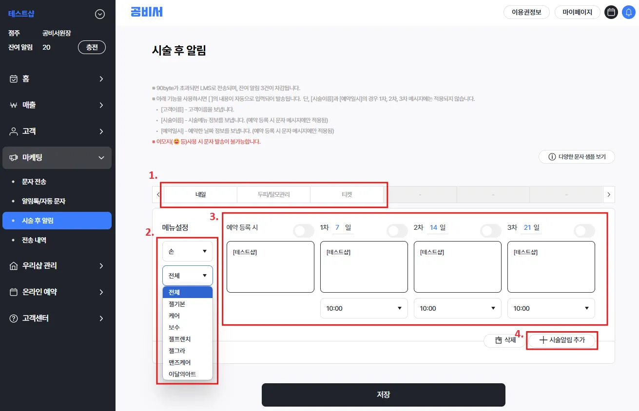 마케팅 → 시술 후 알림을 클릭해 주세요.