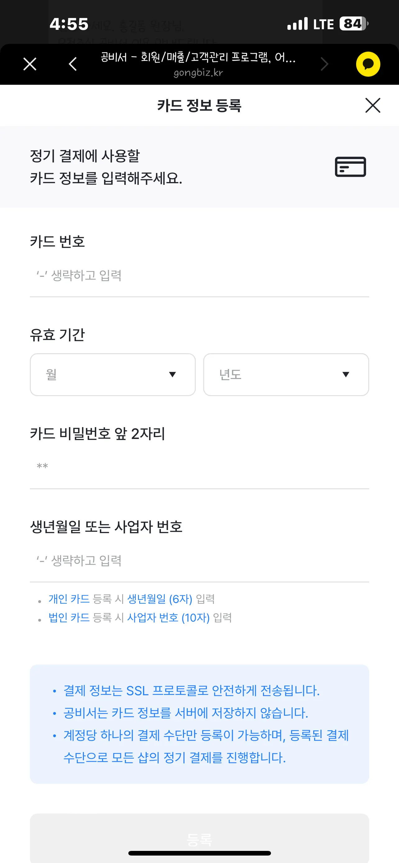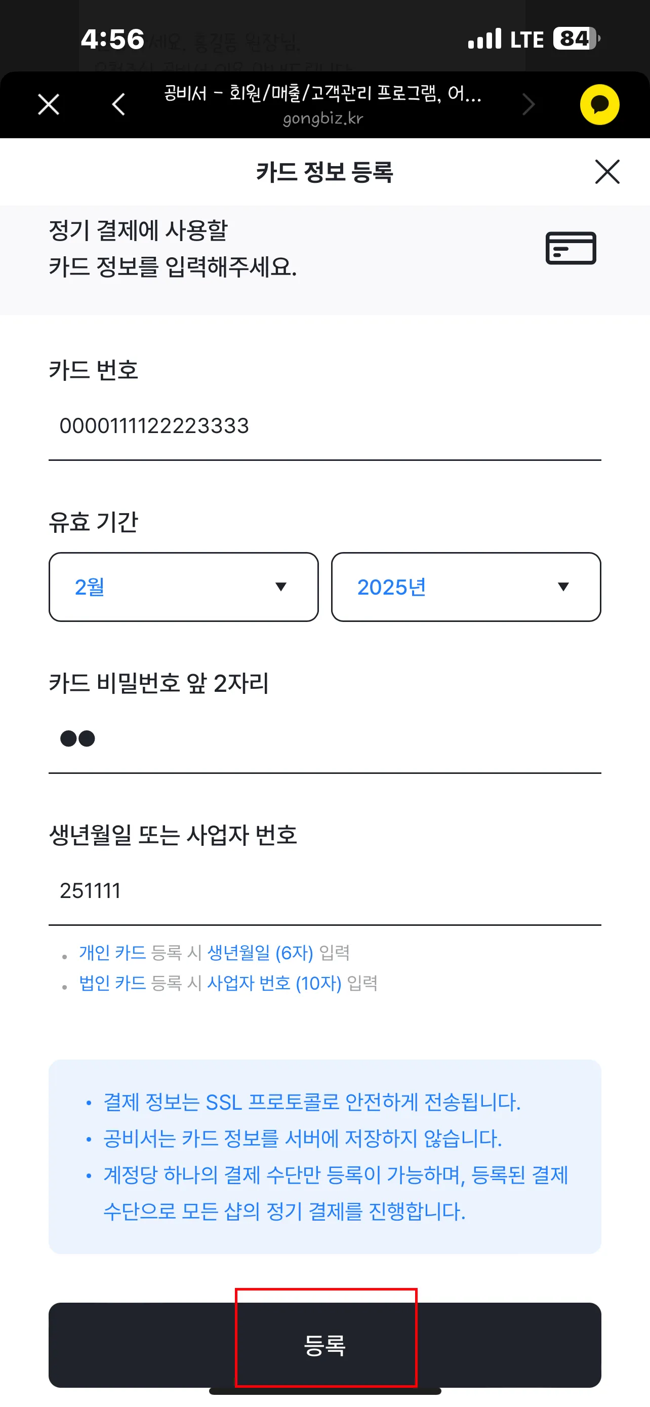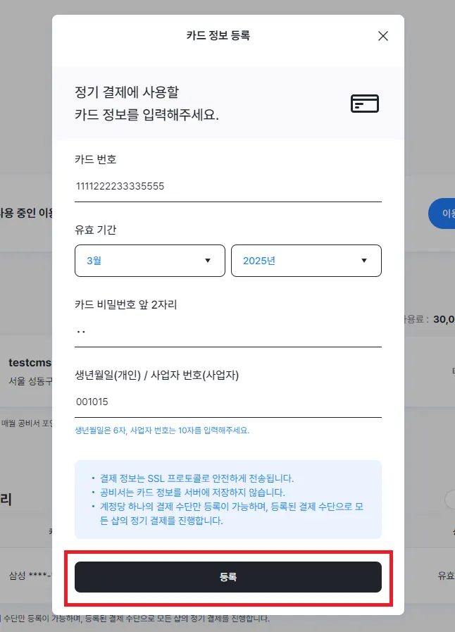 STEP 7 : 이후 등록을 클릭해주시면 최종적으로 정기결제 신청이 완료됩니다.