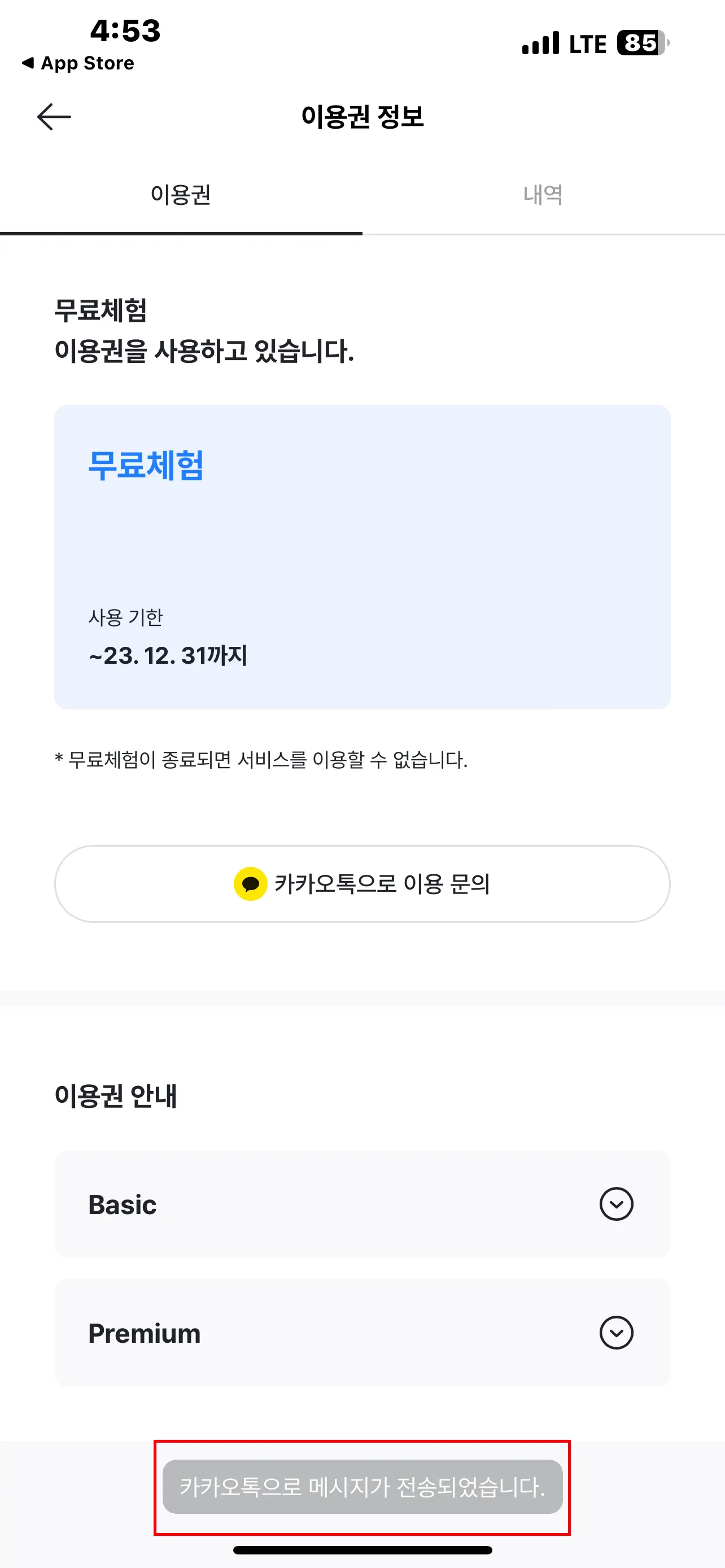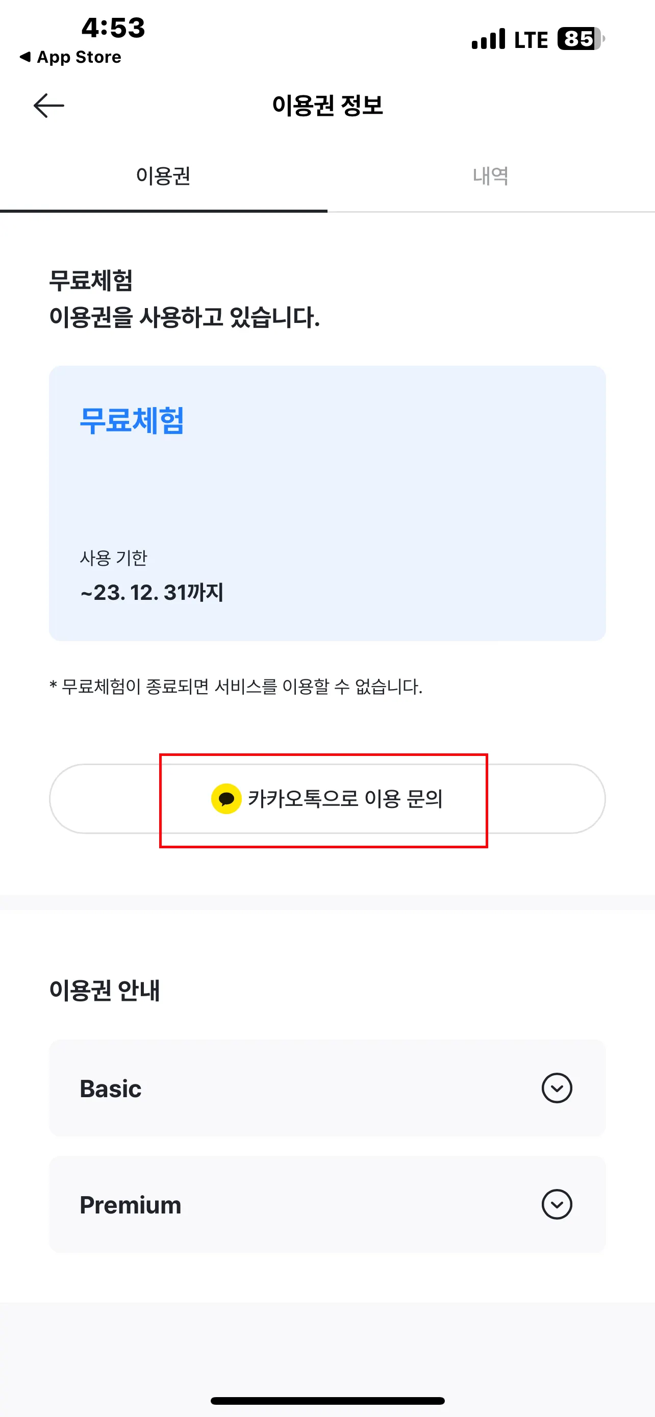 STEP 1 : 이용권 정보 가운데 위치한 [카카오톡으로 이용 문의]를 클릭합니다.