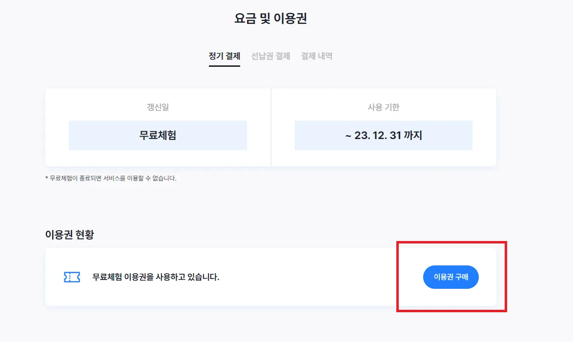 PC : 오른쪽 상단 이용권 정보 > 정기결제 를 통해 이용권 신청 화면으로 이동해주세요.