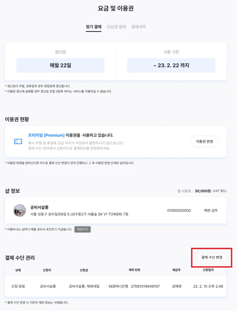 하단 결제수단 관리 메뉴에서 ‘결제 수단 변경’ 을 클릭합니다.