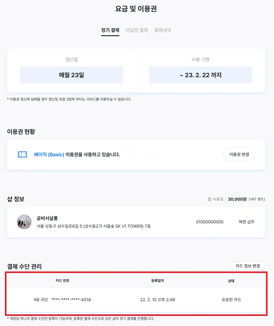 카드 등록이 완료되면 지정된 결제일에 맞추어 정기 결제가 시작됩니다.