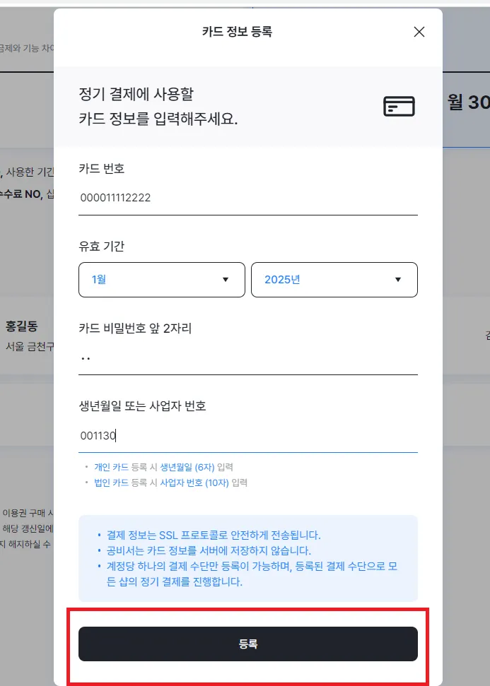 결제에 사용하실 신용카드 정보를 양식에 맞춰 등록합니다.