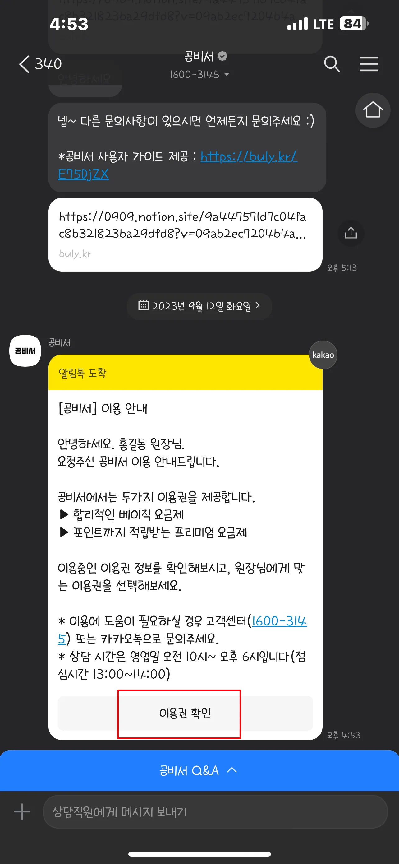 APP 공비서 : 메뉴 > 이용권 정보 > ‘카카오톡으로 문의하기’