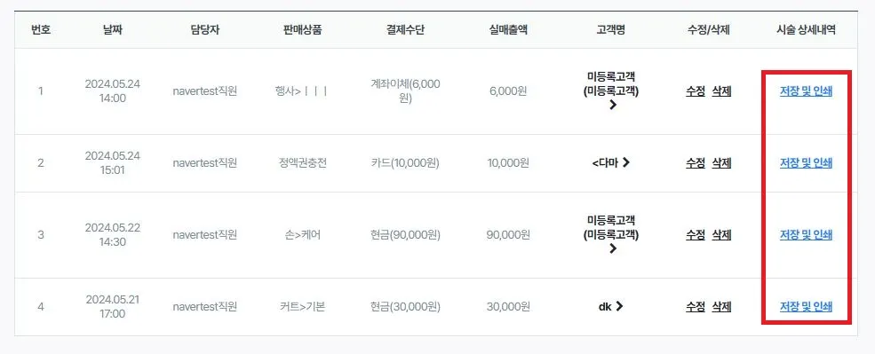 각각의 매출 내역 옆의 ‘시술상세내역 > 저장 및 인쇄’를 확인해주세요.