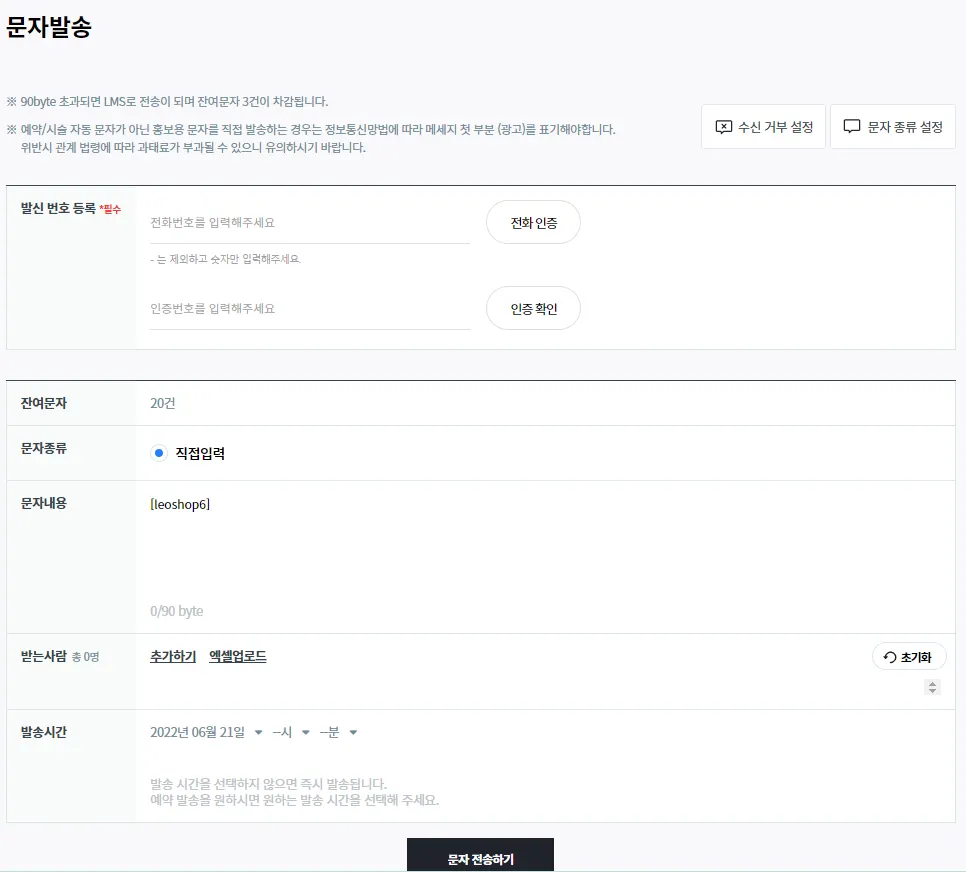 문자 길이가 90byte를 초과되면 LMS로 전환되며 문자 1건 당 잔여알림이 3건씩 차감됩니다.