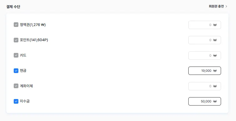 일부 금액만 결제한 경우 결제수단에 맞게 구분하여 입력할 수 있습니다.