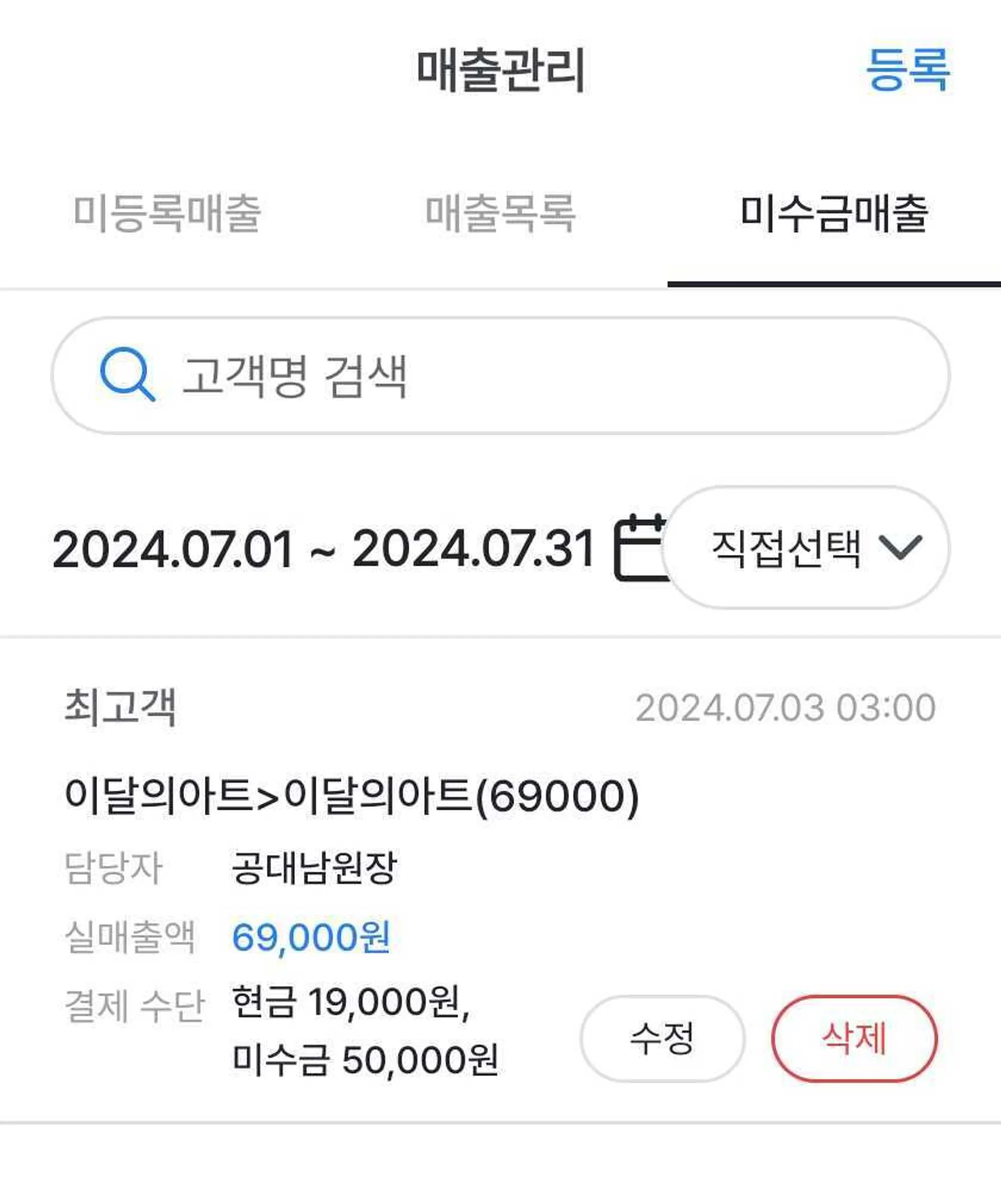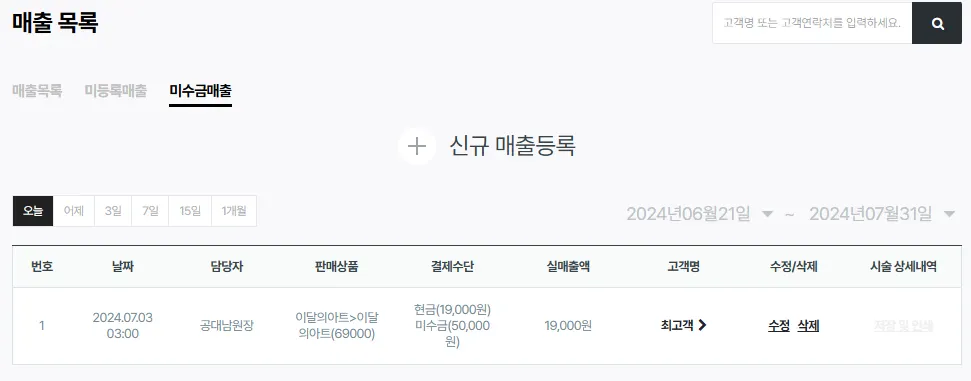 미수금에 대한 결제가 완료되었다면 매출 내역을 [수정]하여 다시 등록할 수 있습니다.