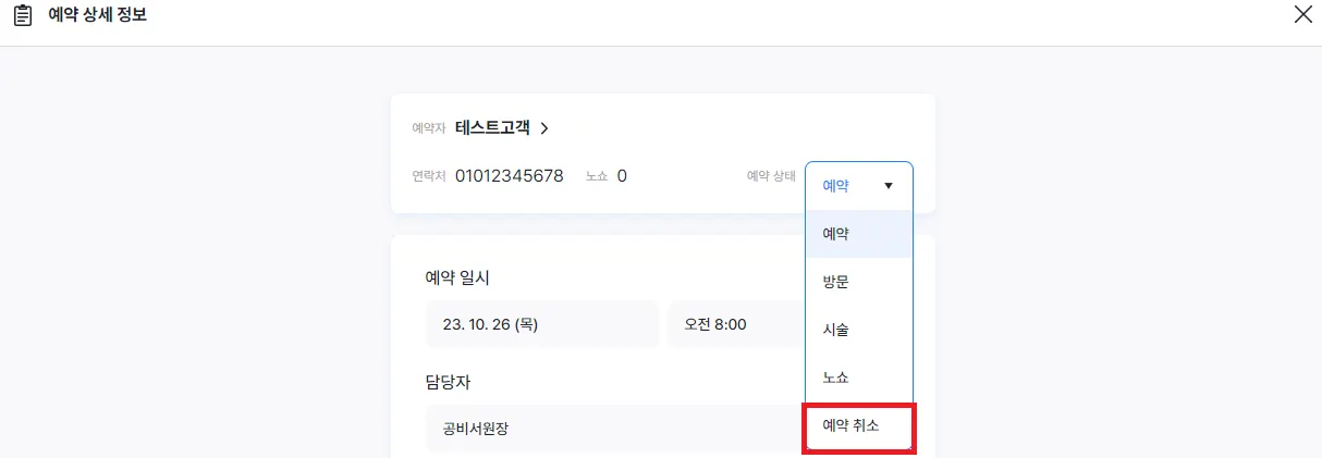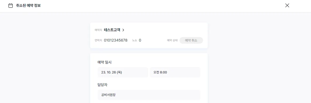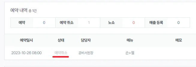 예약 취소로 처리할 경우 해당 고객의 고객차트에서 그 내역을 볼 수 있습니다.