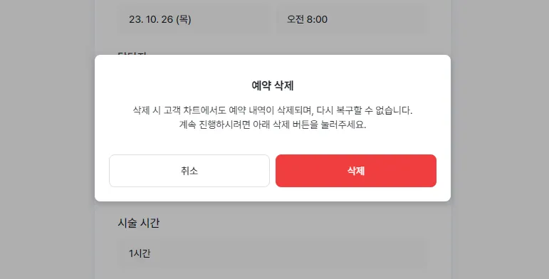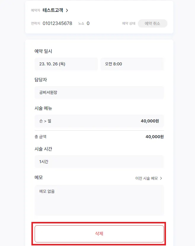 ’예약삭제’ 처리 시에는 캘린더와 고객차트에서 그 내역이 모두 사라집니다.
