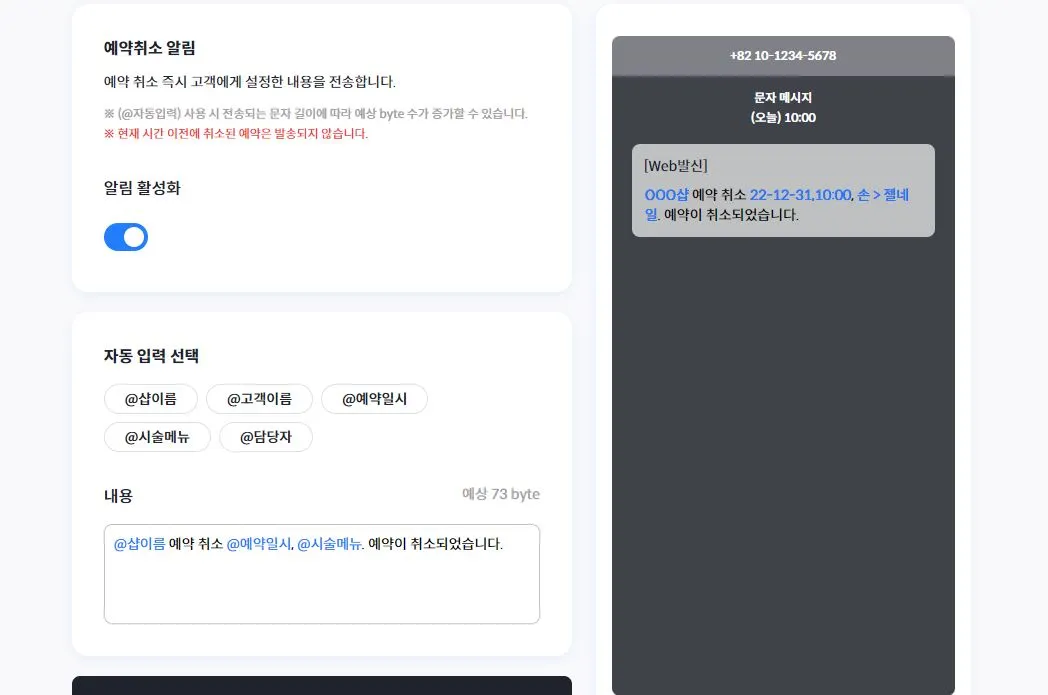 알림톡/자동문자 모두 동일하게 예약 취소 처리 시 발송됩니다.