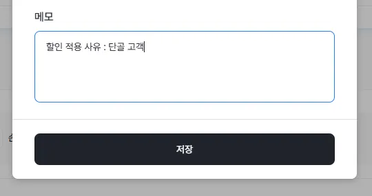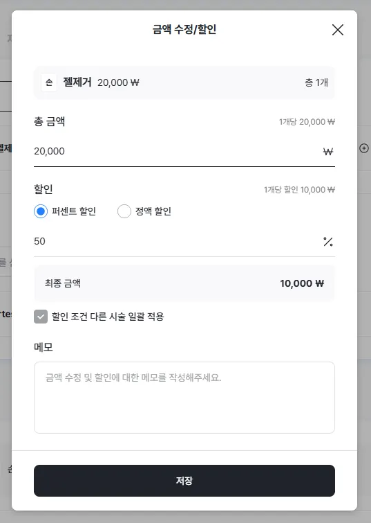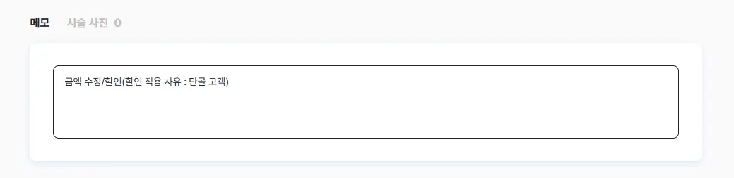 할인/금액 변경 적용 시 ‘메모’에 입력한 메모는 하단 ‘매출 메모’에 자동으로 입력됩니다.