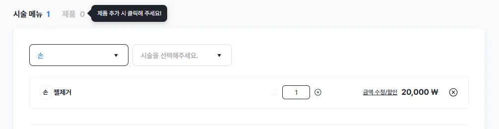 매출 등록 시 시술메뉴에 대해 결제금액 할인/추가를 적용하여 금액을 변경할 수 있습니다.