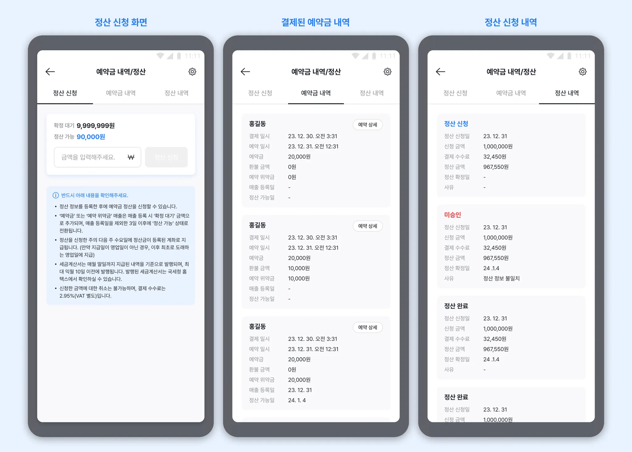 지금까지 결제된 예약금에 대해 정산 신청을 통해 받아보는 방법을 확인해보세요!