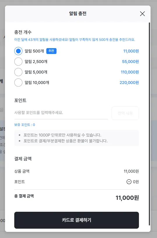 알림 충전은 카드 결제로 진행할 수 있습니다.