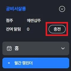 샵 이름 옆의 ‘[충전] 버튼’을 통해 이동할 수 있습니다.
