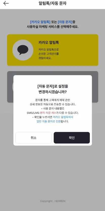 카카오 알림톡 아래 자동 문자를 선택하시면 설정 변경과 함께 안내 문구 확인하실 수 있습니다.