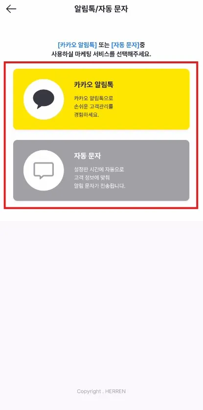앱 > 메뉴 > 알림톡/자동문자 메뉴를 확인할 수 있습니다.