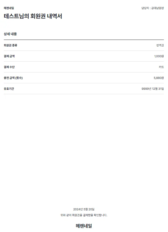회원권 내역서 - 회원권(정액권, 티켓) 충전 내역(결제수단, 충전금액, 유효기간 등)