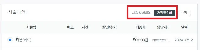 각각의 매출 내역 옆의 ‘시술상세내역 > 저장 및 인쇄’를 확인해주세요.