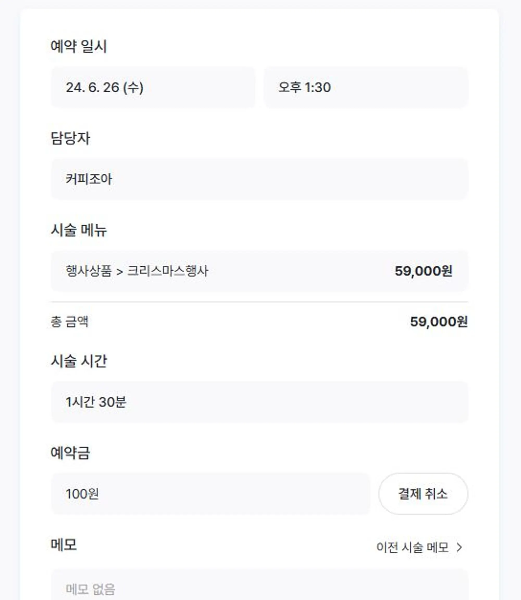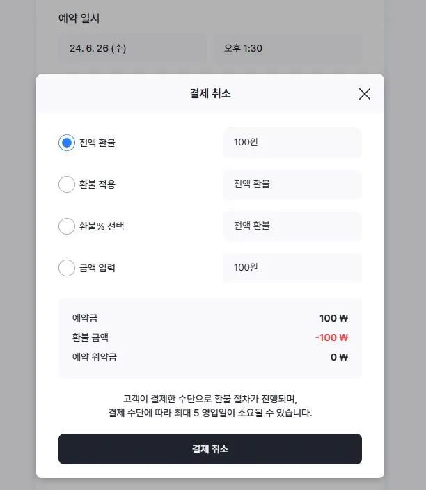 카드 결제 취소 : 시술 후 예약 정보에서 예약금 카드 결제를 취소합니다.