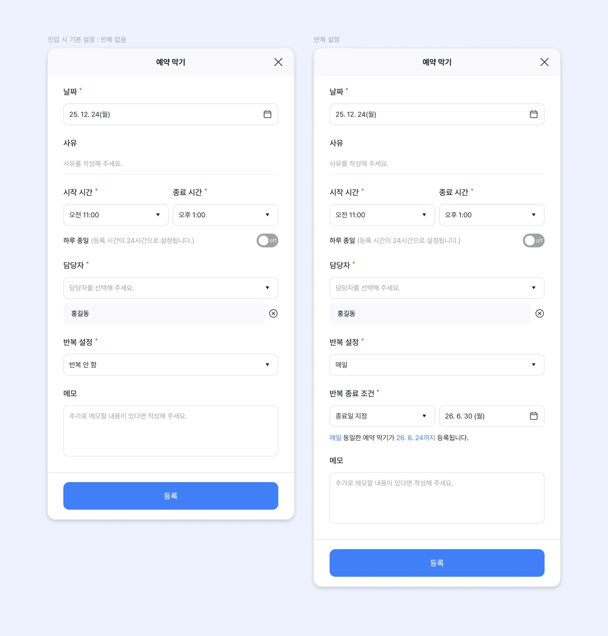 (Step2) 예약 막기를 위해, ‘반복설정’ 과 ‘반복 종료 조건’을 설정한 후 등록해 주세요.