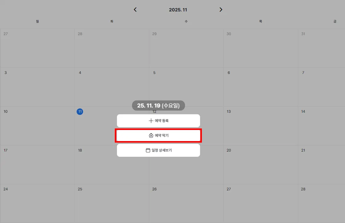 (Step1) 캘린더에서 수정/삭제할 예약 막기 구간을 선택한 뒤, 수정 또는 삭제를 진행해 주세요.