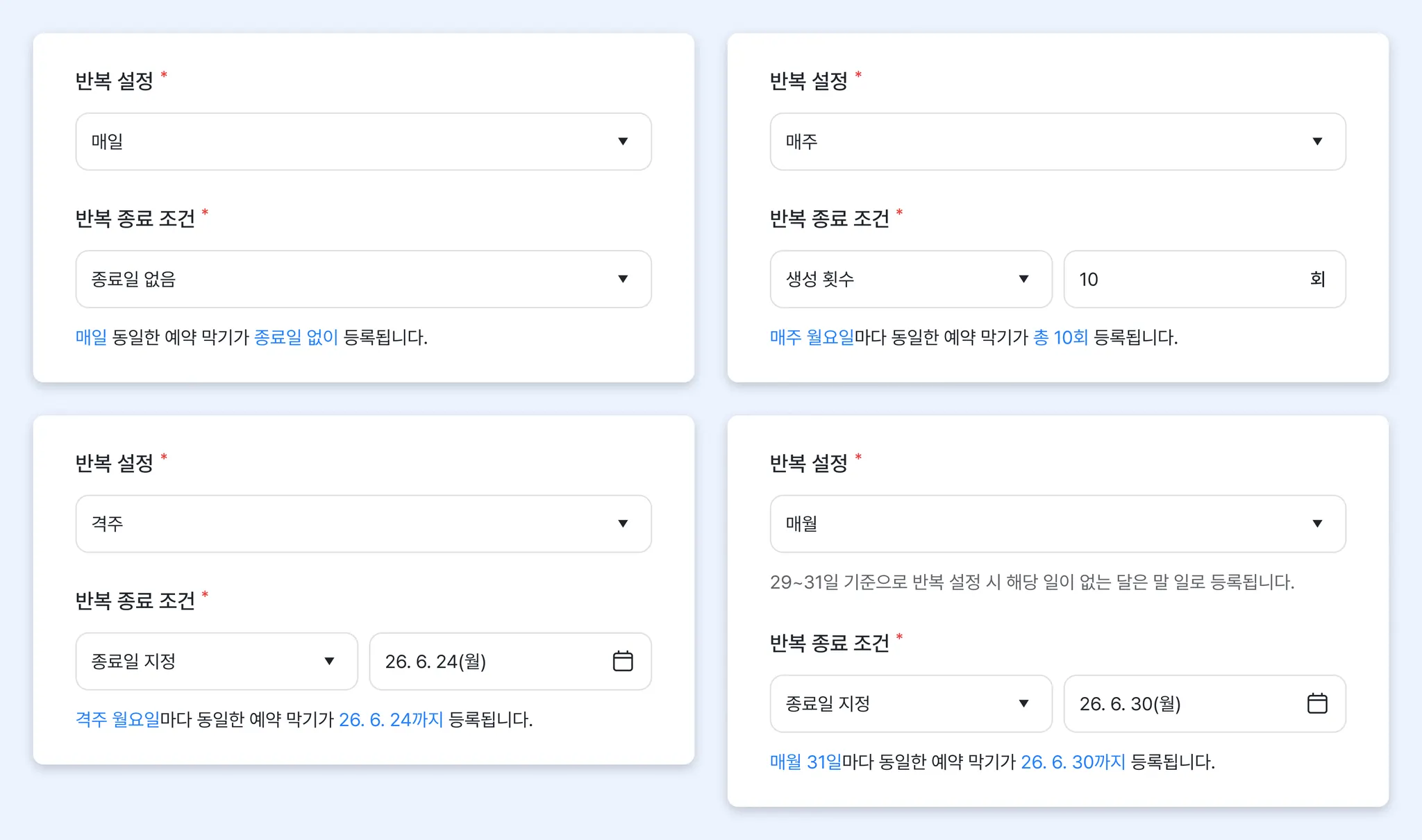 반복 종료 조건 : 종료일 없음/ 생성 횟수/ 종료일 지정
