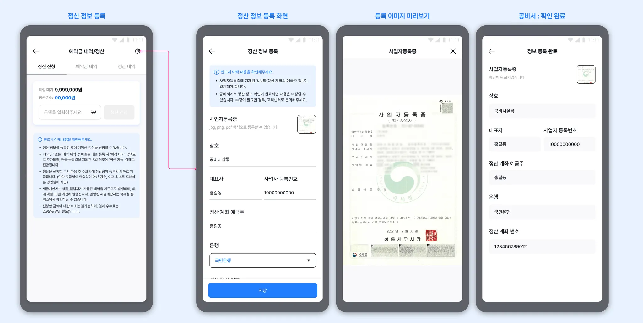 정산을 신청하려면 반드시 사업자등록증, 계좌 정보 등 정산 정보 등록이 필요합니다.