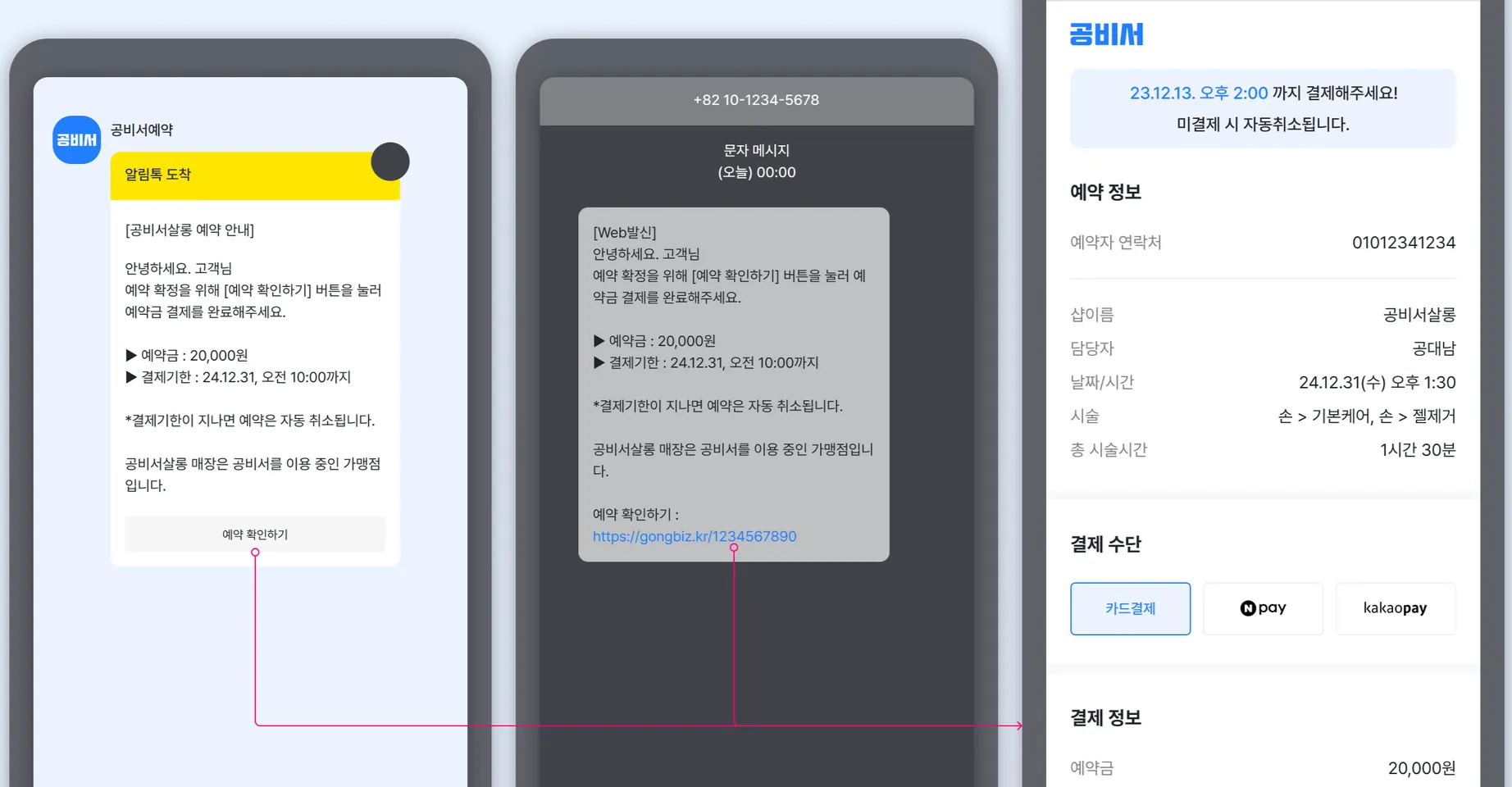 알림톡 혹은 문자 수신 후 고객님께서 직접 결제를 해주시면 예약금 결제가 처리됩니다.