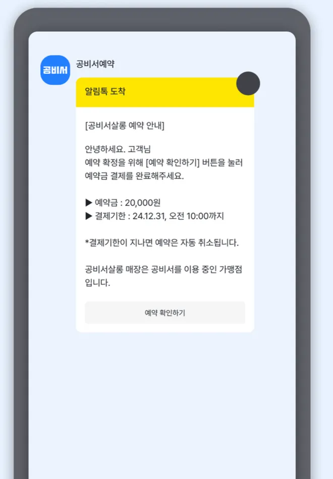 고객님에게 전송되는 예약금 결제 알림톡 및 문자는 모두 ‘무료’로 전송됩니다.