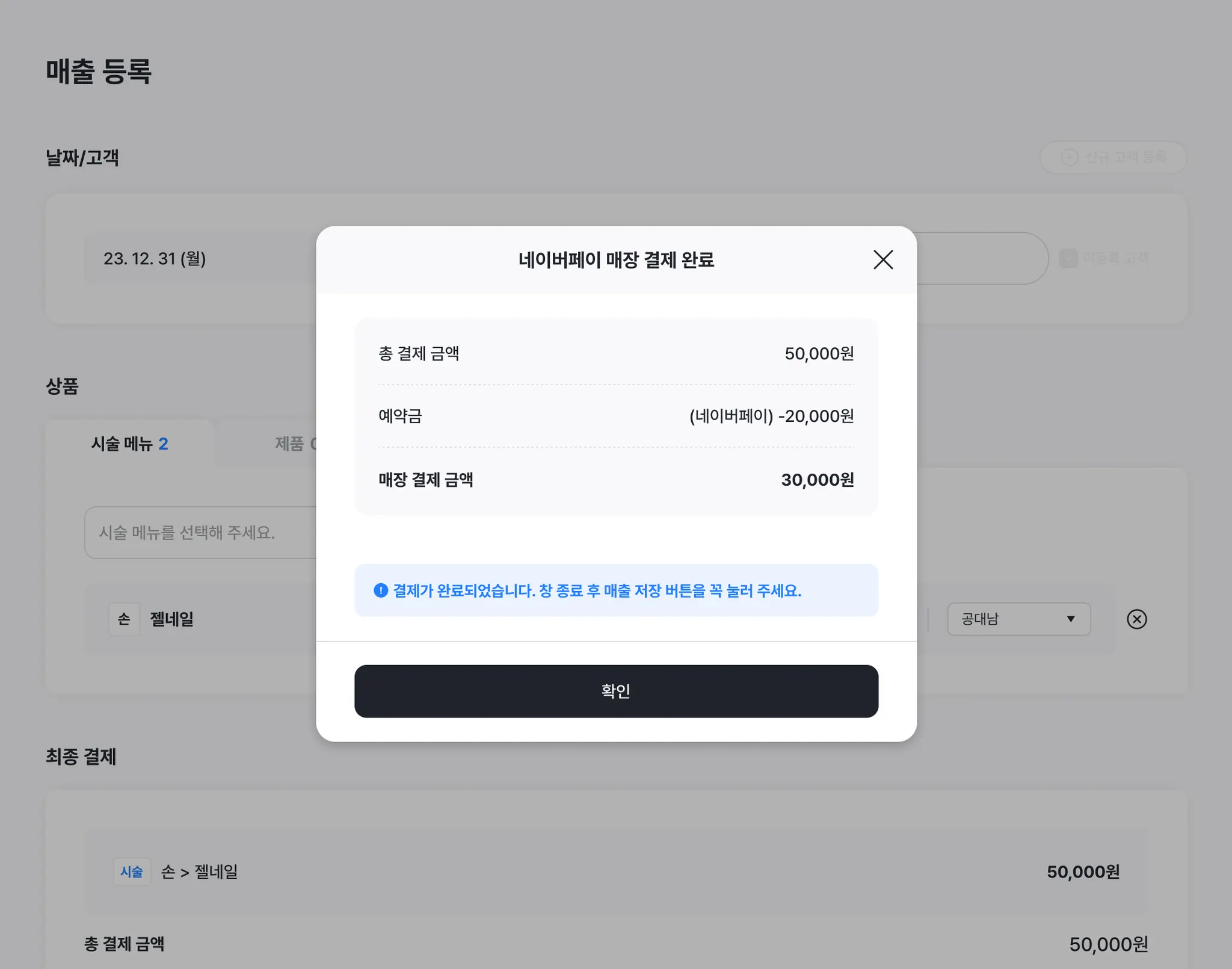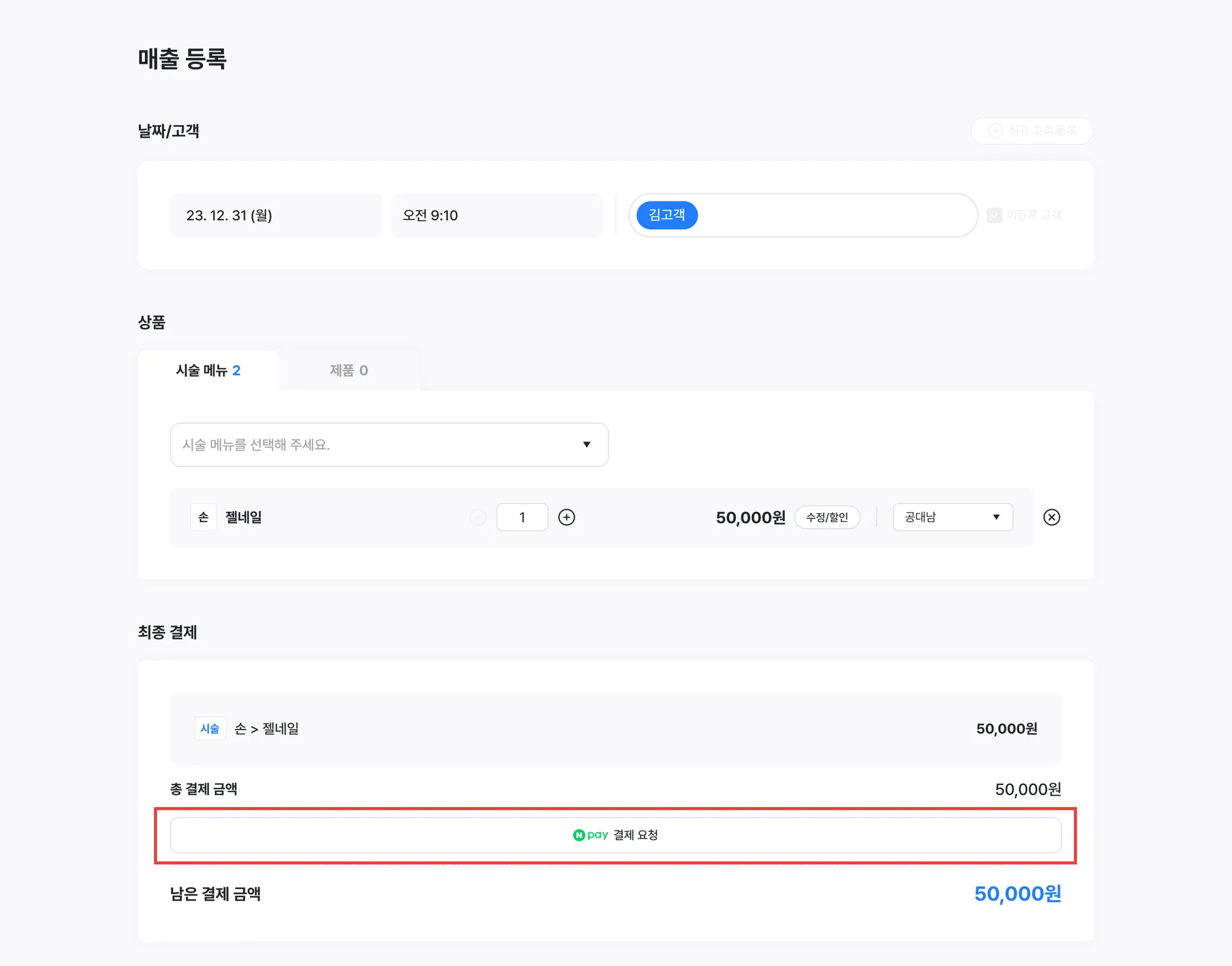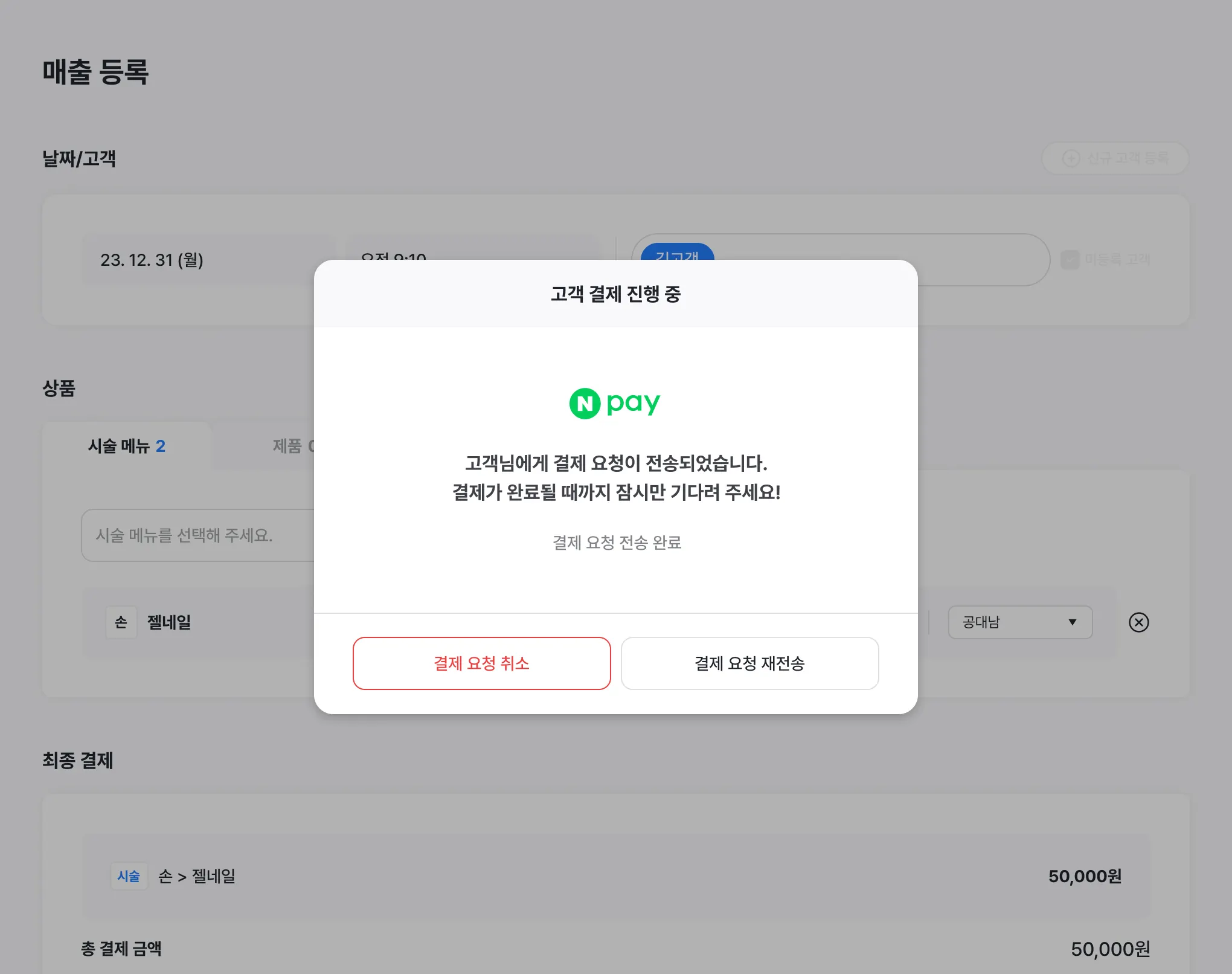 NPay 사용 디자이너의 예약 건의 경우, 매출 등록 시 ‘NPay 결제 요청’ 버튼이 노출 됩니다.