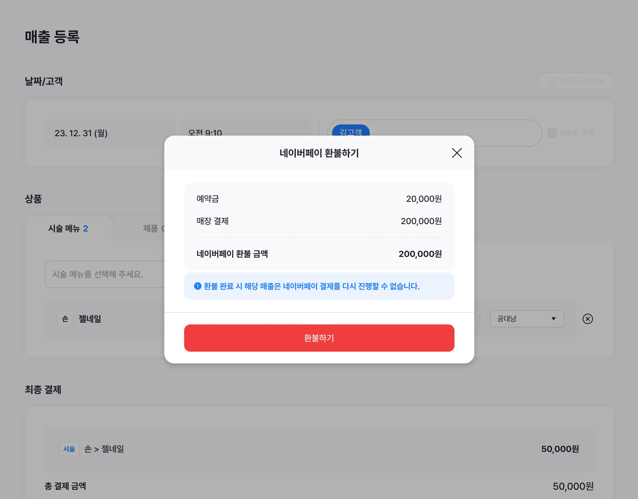 환불 완료 시 해당 매출은 네이버페이 결제를 다시 진행할 수 없습니다.