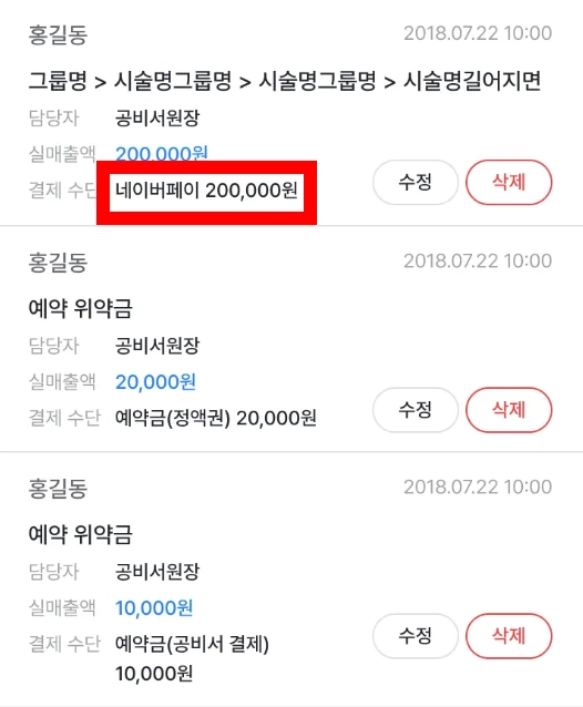 네이버페이 매장 결제 내역의 결제수단은 ‘네이버페이’ 로 저장 됩니다.