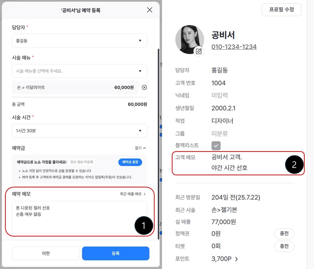 PC/APP : 예약 상세 정보 > 예약 메모 or 고객 차트 > 고객 메모