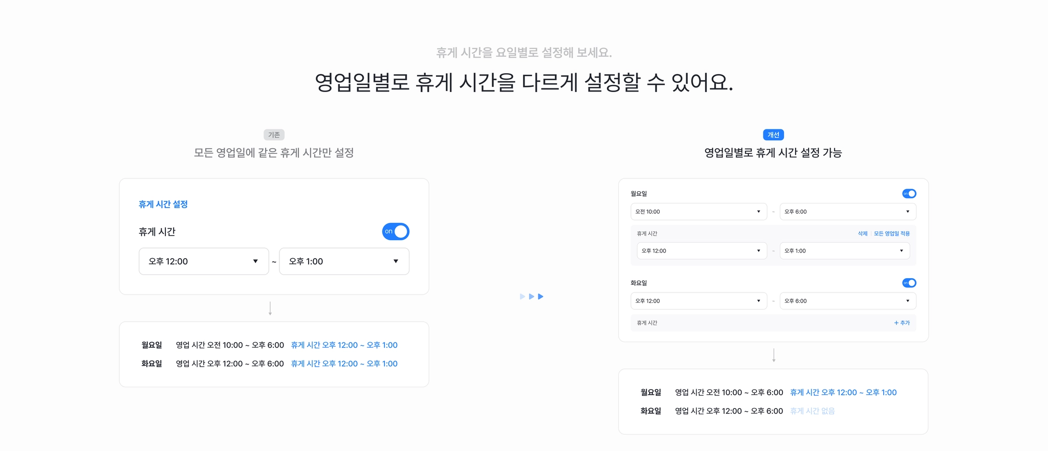 영업시간과 직원 근무시간의 휴게시간을 요일별로 세분화하여 설정할 수 있도록 개선되었습니다.