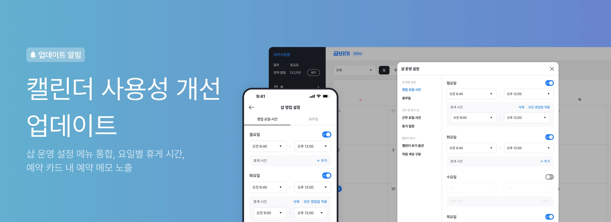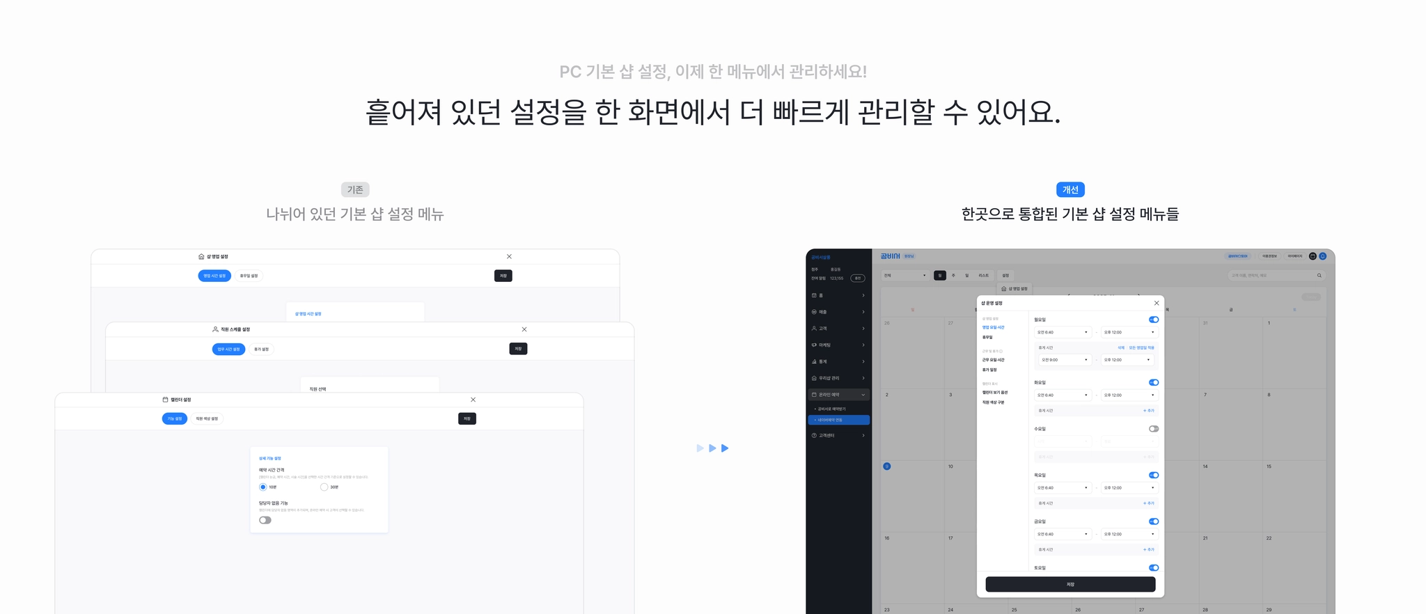 샵 운영과 일정 관리 설정을 한 화면에서 관리할 수 있도록 개선되었습니다.