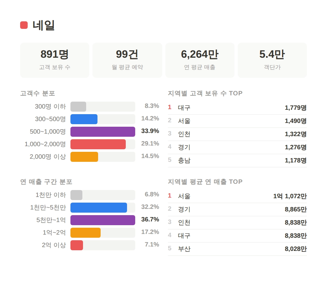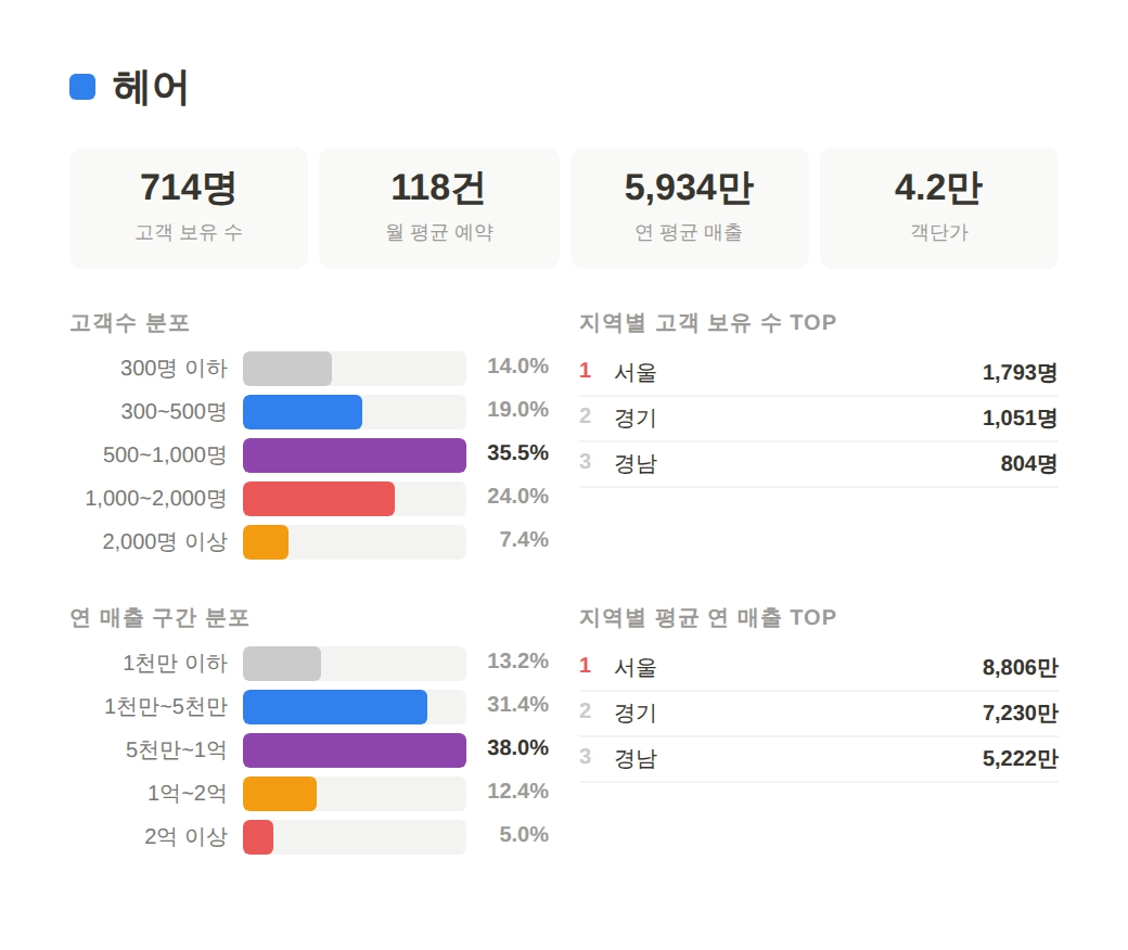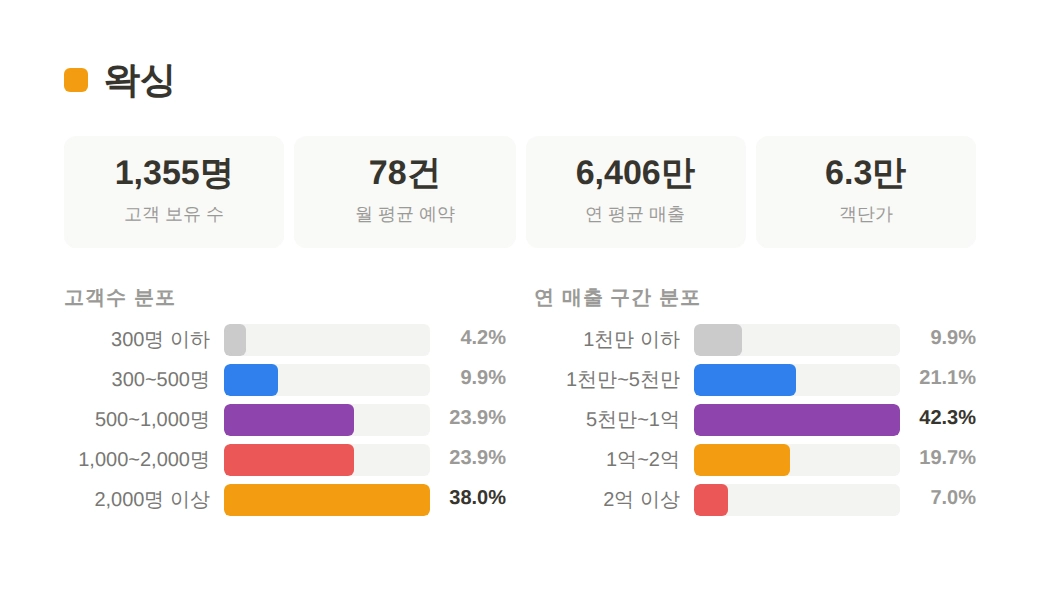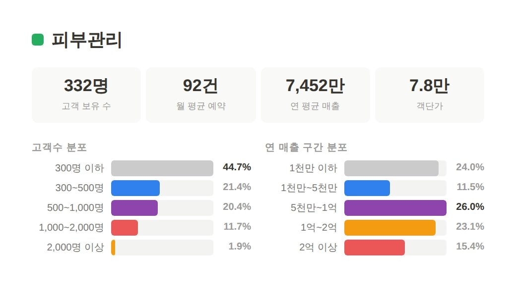 • 고객 보유 수가 전 업종 중 가장 많지만, 매달 실제로 예약하는 고객은 약 8% 수준이에요.