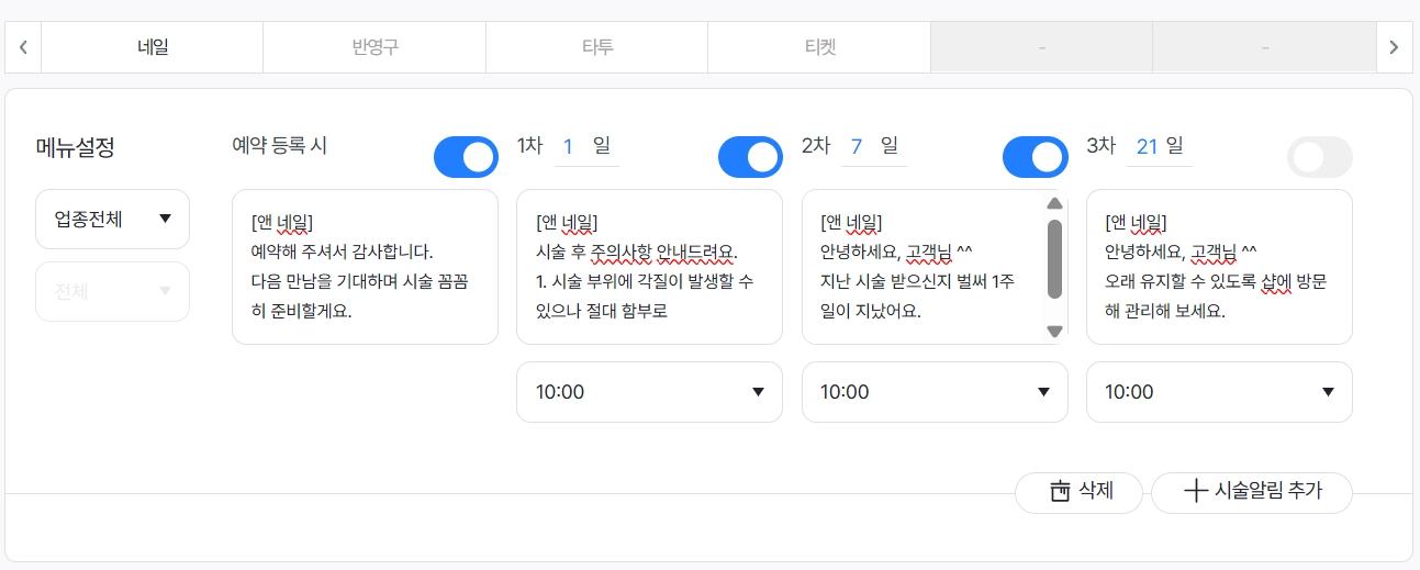 시술 별로 알림을 다르게 설정할 수 있어 고객 맞춤 관리에 유용합니다.
