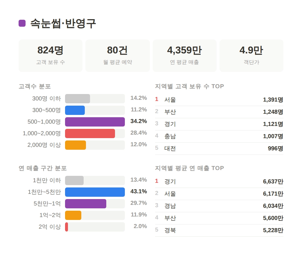 • 고객 보유 수는 타 업종 대비 적지만, 높은 객단가와 재방문 빈도 덕에 매출은 오히려 가장 탄탄해요.