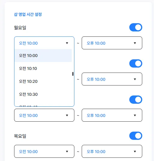 예약가능 시간의 ‘시작시간’과 ‘종료시간’을 눌러 샵의 영업가능 시간을 설정할 수 있습니다.