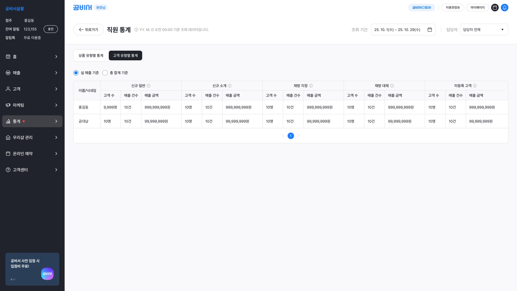 직원별로 고객을 신규 일반 / 신규 소개 / 재방 지정 / 재방 대체 / 미등록 고객으로 구분하여 확인 가능