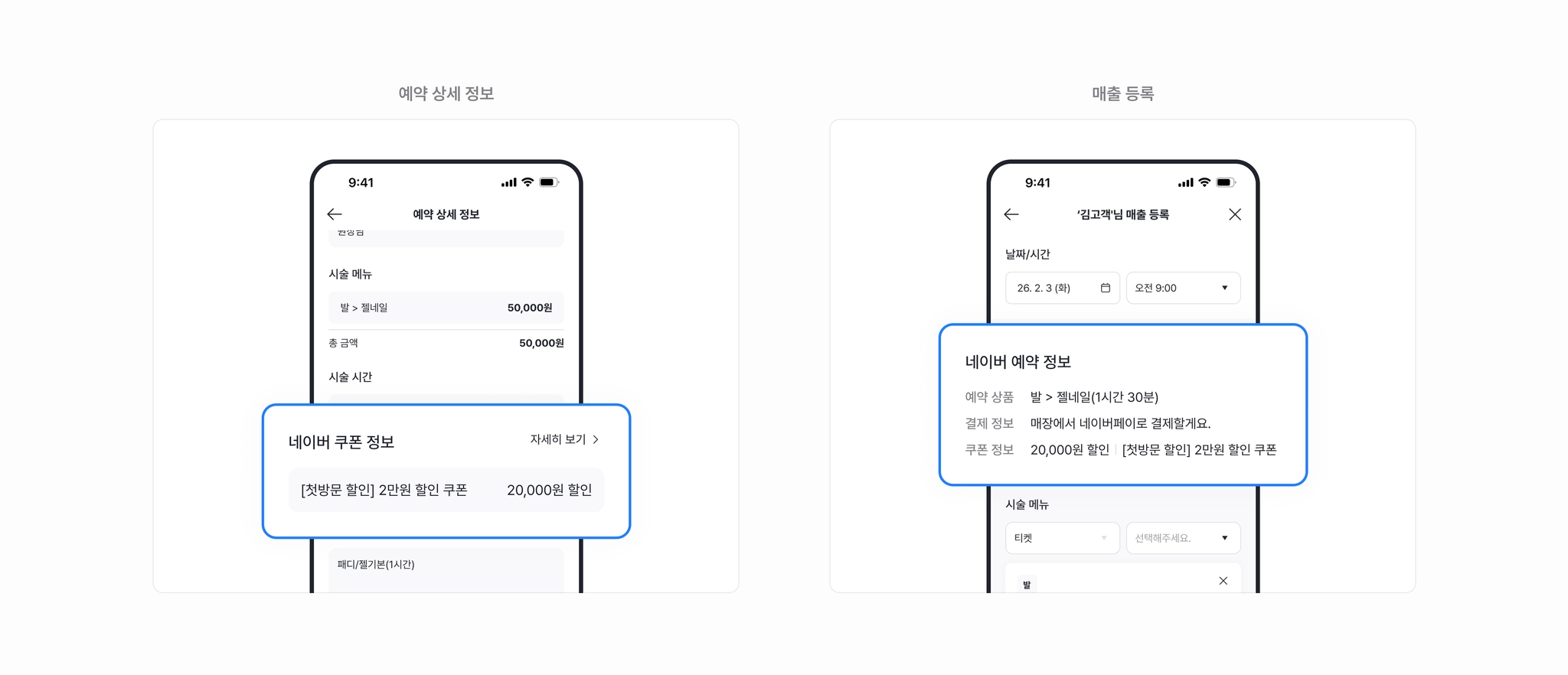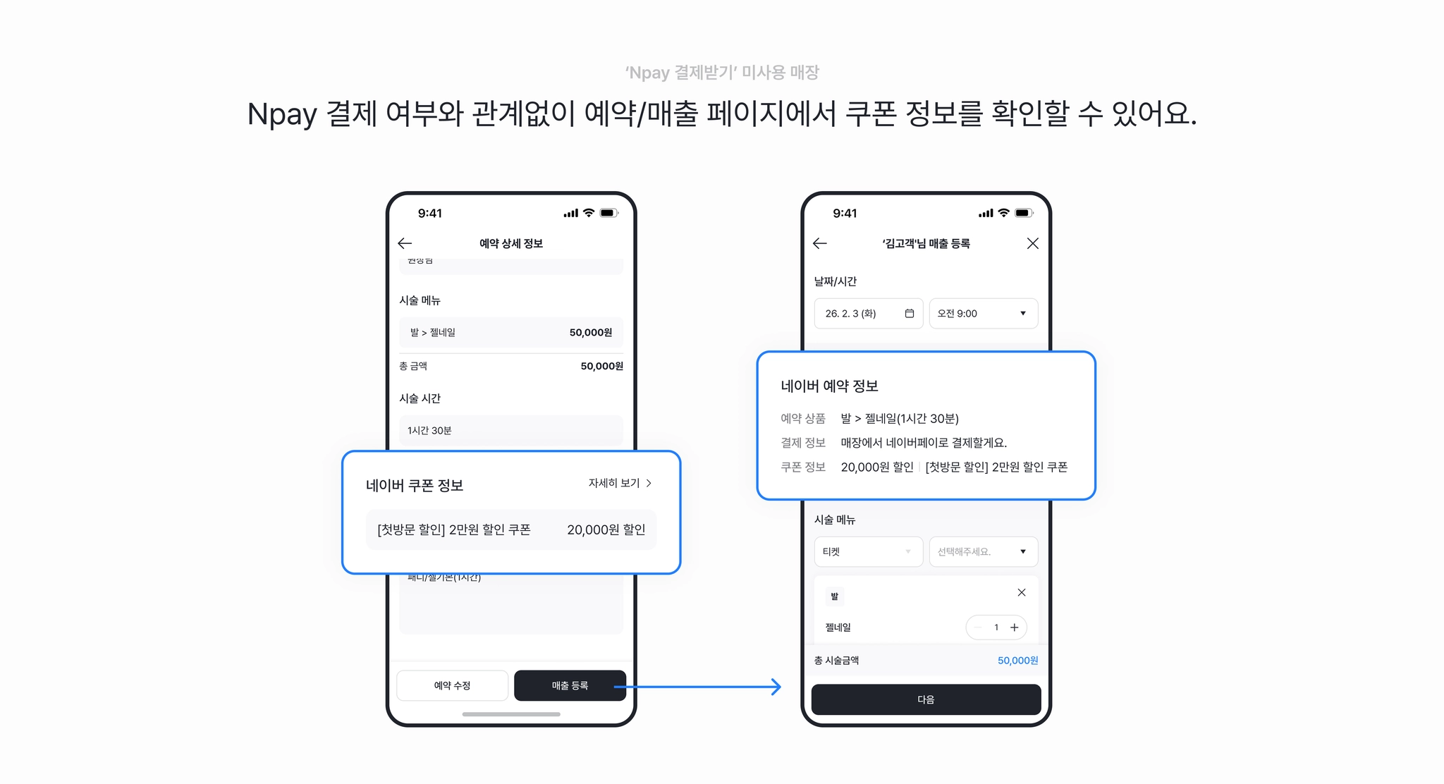 Npay 결제 여부와 관계없이 예약/매출 페이지에서 쿠폰 정보를 확인할 수 있어요.