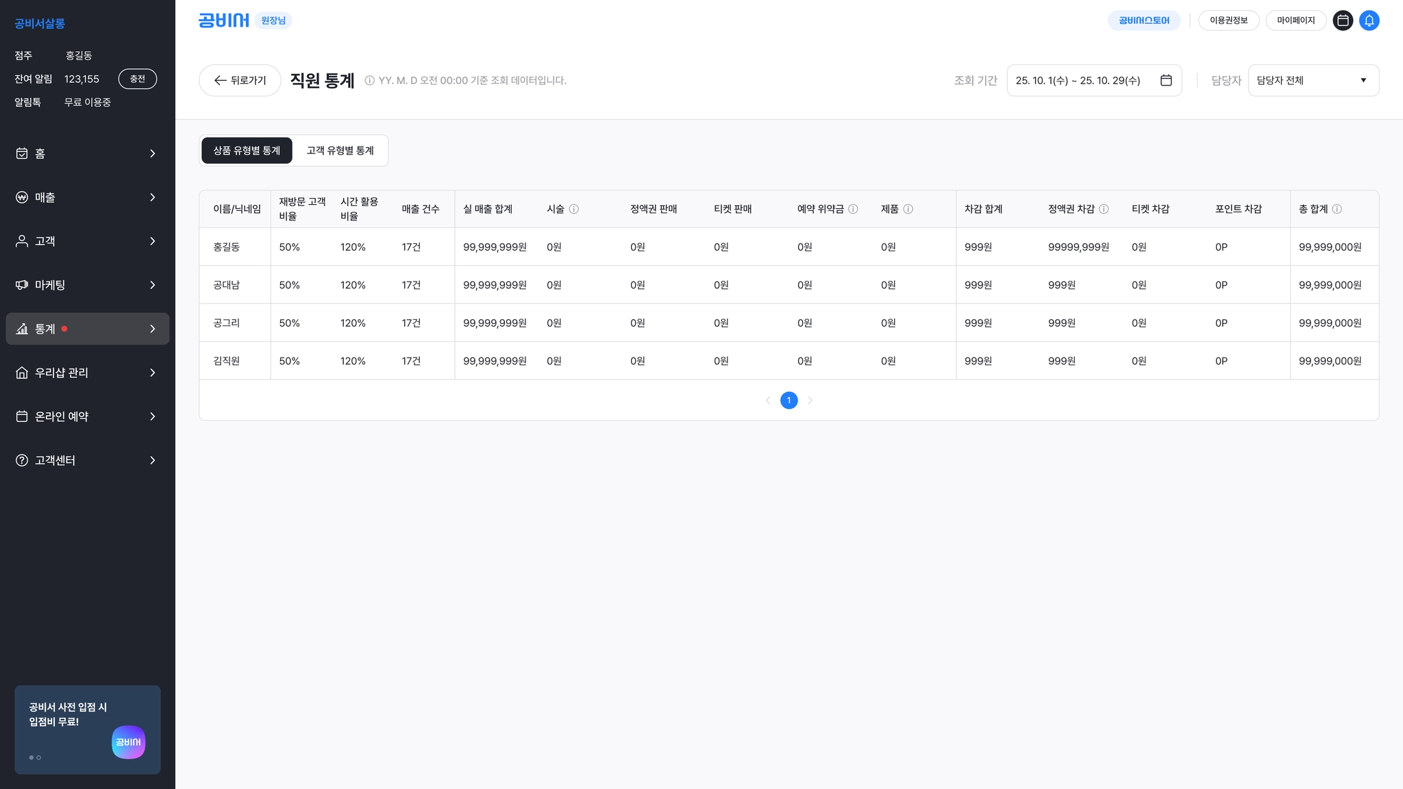 각 직원별로 재방문 고객 비율, 시간 활용 비율, 매출 건수 등 핵심 지표를 확인할 수 있습니다.