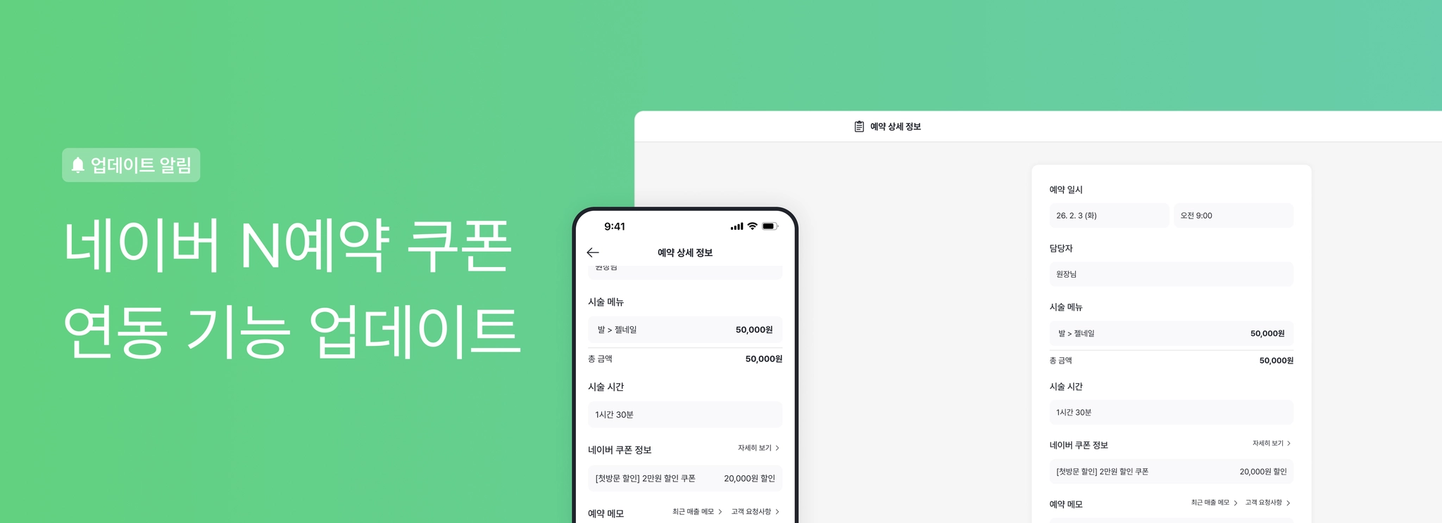 이제 공비서에서 네이버 예약 등록 시, 고객이 보유한 네이버 예약 쿠폰을 함께 사용할 수 있습니다.