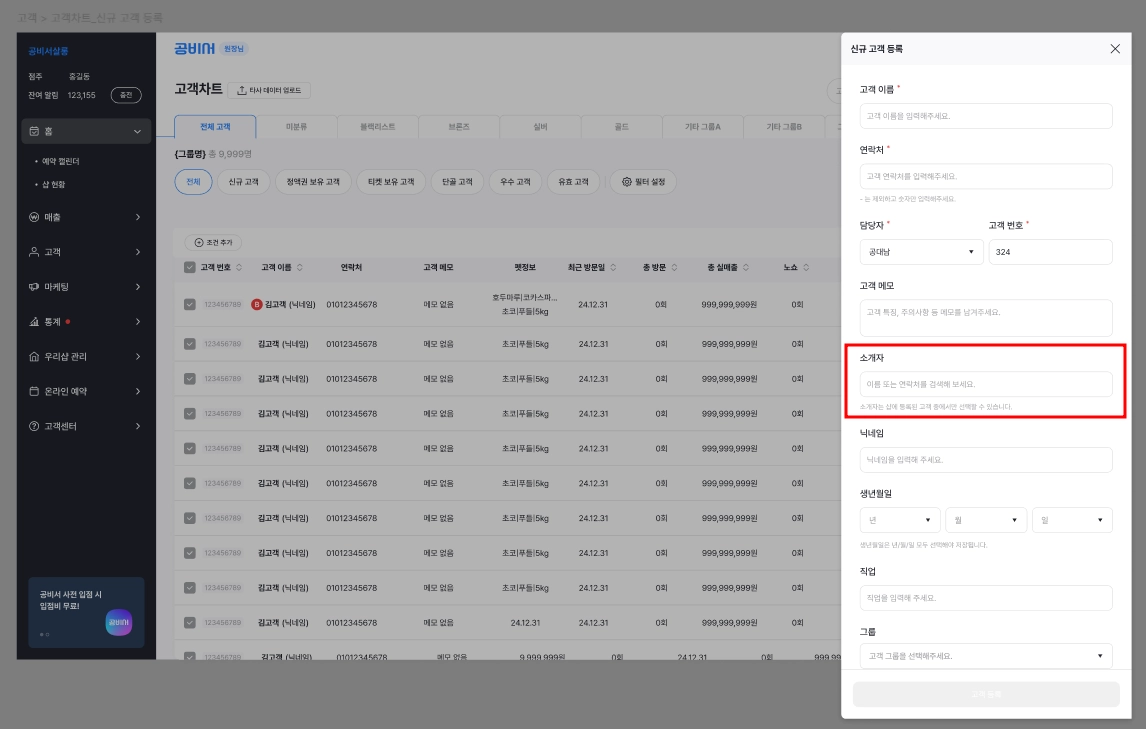 기존 고객 중 누구의 소개로 방문했는지 설정 가능하여 고객 유입 흐름을 한눈에 파악할 수 있어요.