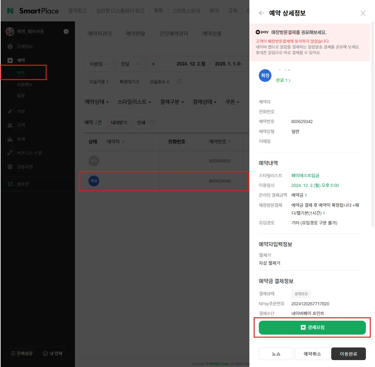 N페이 매장방문결제를 사용하시려면, 네이버 스마트 플레이스 → 예약 → 예약 → 해당 예약 클릭 → 결제요청 버튼을 누르시면 됩니다. 공비서 원장님에서 매출 등록 전 결제 요청을 해주세요.