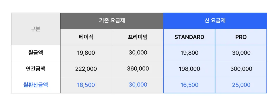 기존 월 요금제가 아닌 신 요금제 월간 [STANDARD / PRO]으로 신청할 수도 있습니다.