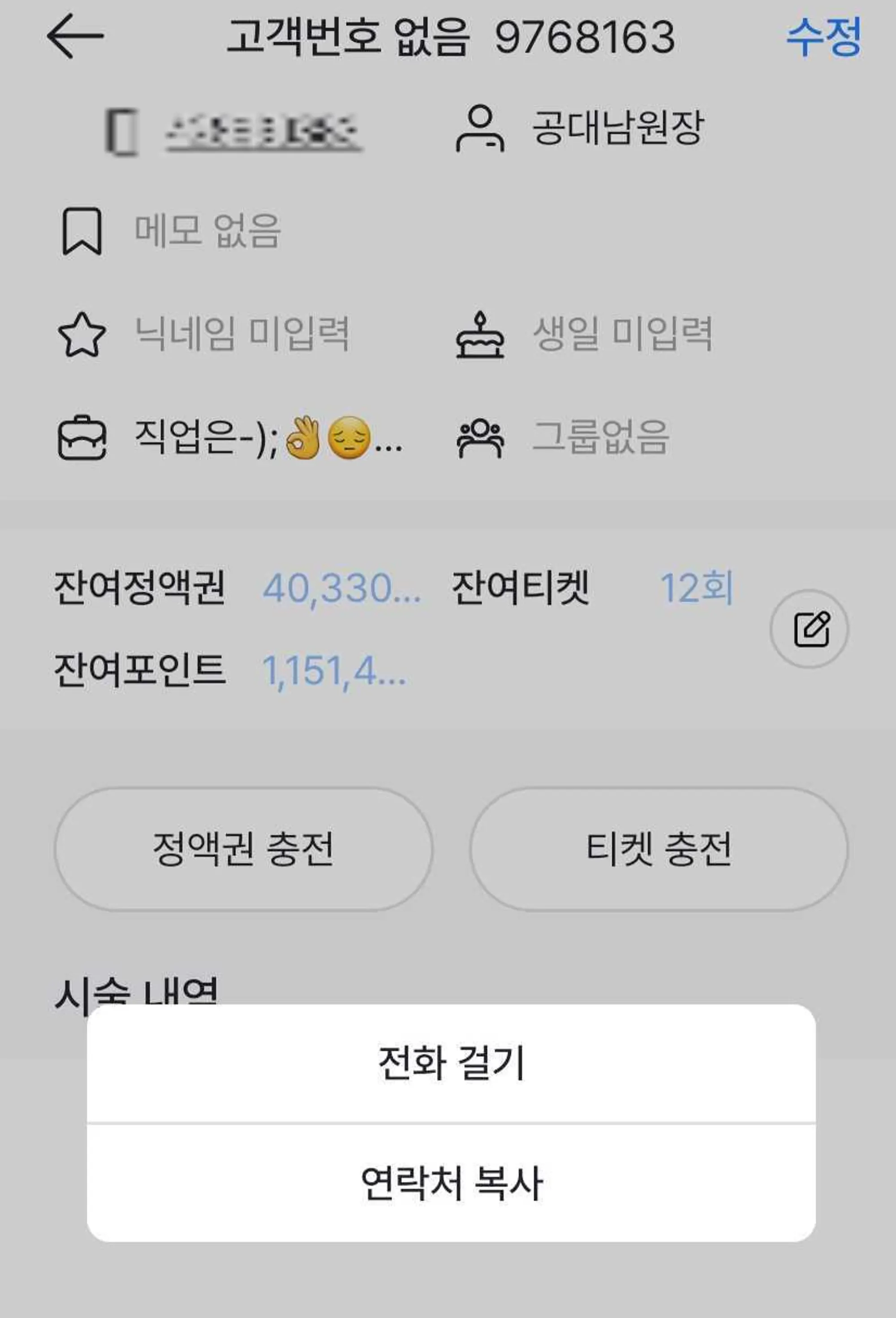 고객차트의 고객 연락처를 누르면 전화 걸기 외에 연락처 복사가 가능하여 원하는 곳에 붙여넣기를 할 수 있습니다.