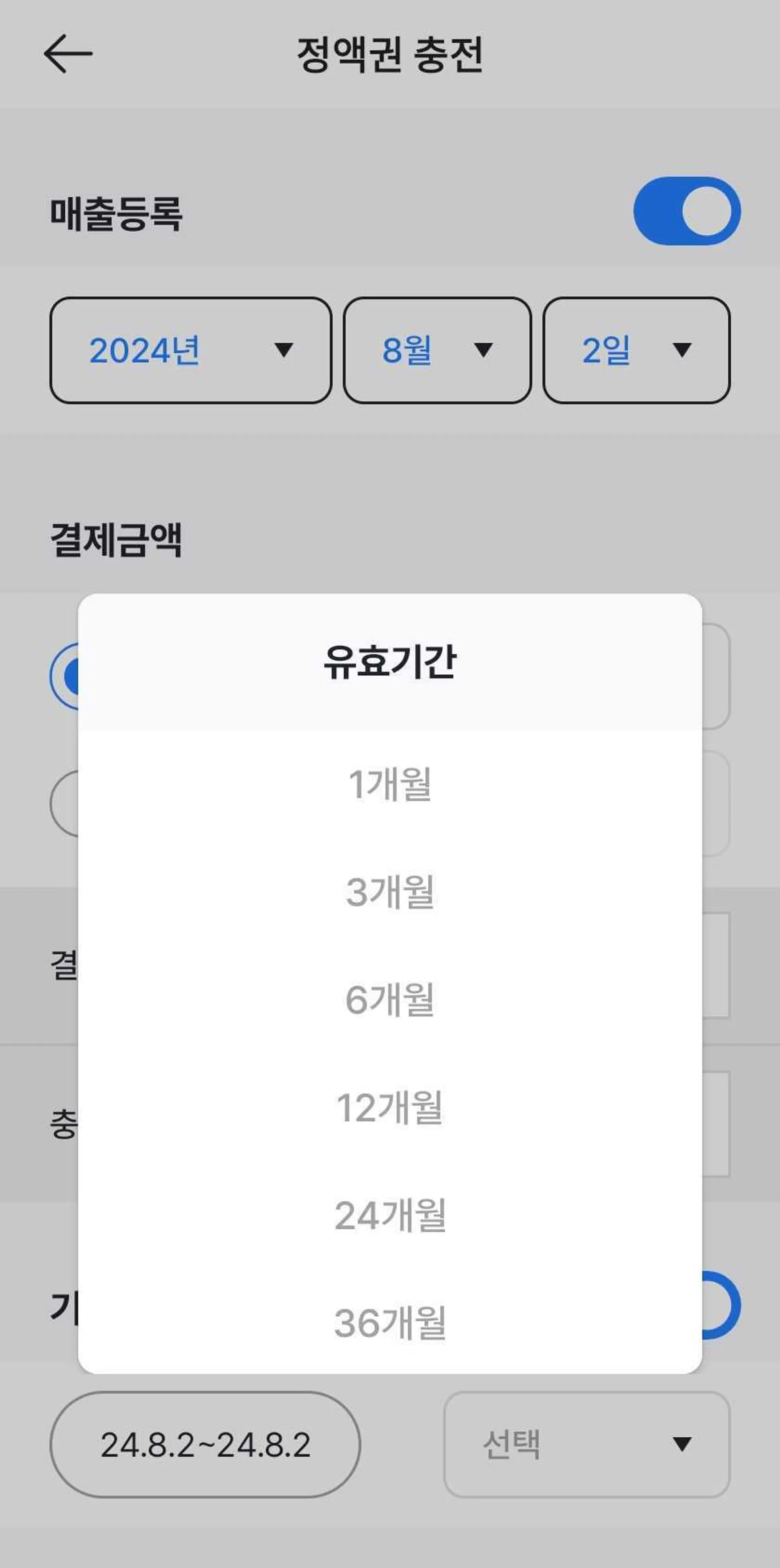회원권(정액권, 티켓) 충전 시 - 유효기간 24개월, 36개월 항목 신설